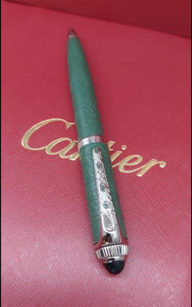 قلم أنيق يلفت النظر، بلون فضي راقٍ وتصميم يحمل بصمة كارتييه المميزة.