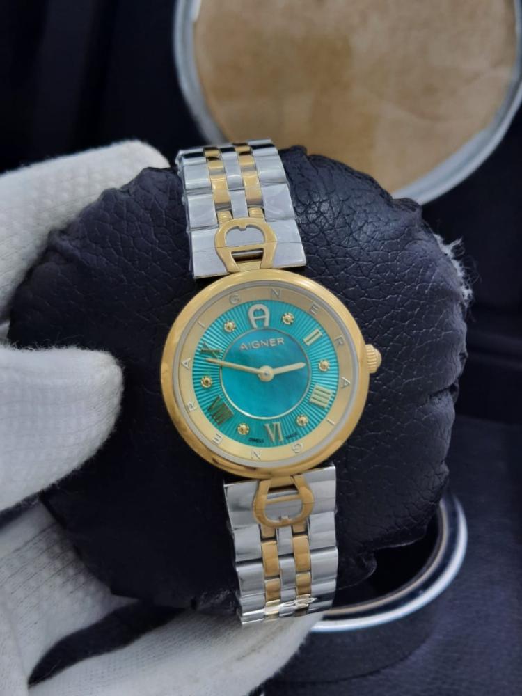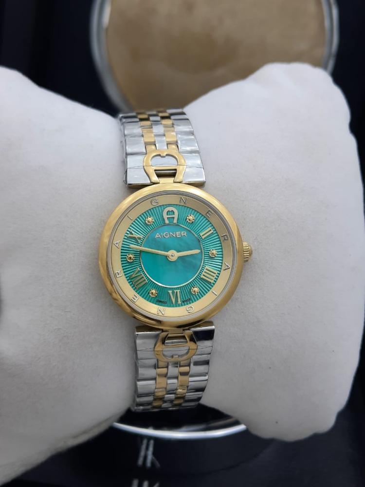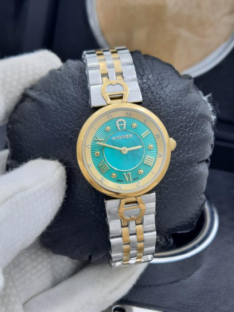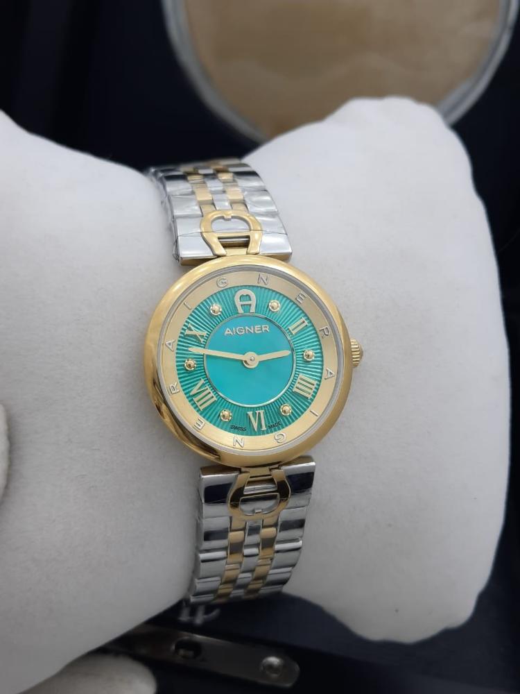 ساعة بتفاصيل ناعمة وأناقة واضحة من أول نظرة. تصميم دائري بلون ذهبي أنيق مع مينا مميز بلون التركواز، يلتقي فيه المعدن الفاخر مع لمسة آغنر المميزة. السوار مزدوج اللون من ستانلس ستيل (فولاذ 306L) مقاوم للصدأ، ويحافظ على لمعانه مع الوقت.