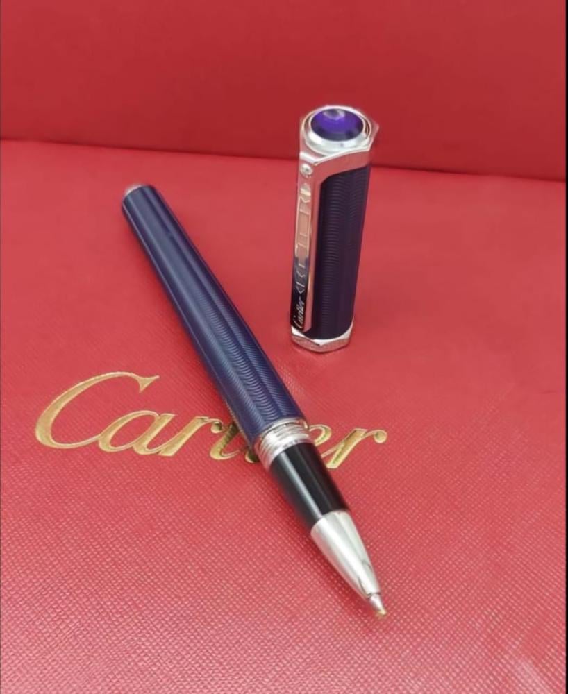 قلم أنيق يلفت النظر، بلون أزرق راقٍ وتصميم يحمل بصمة كارتييه المميزة.