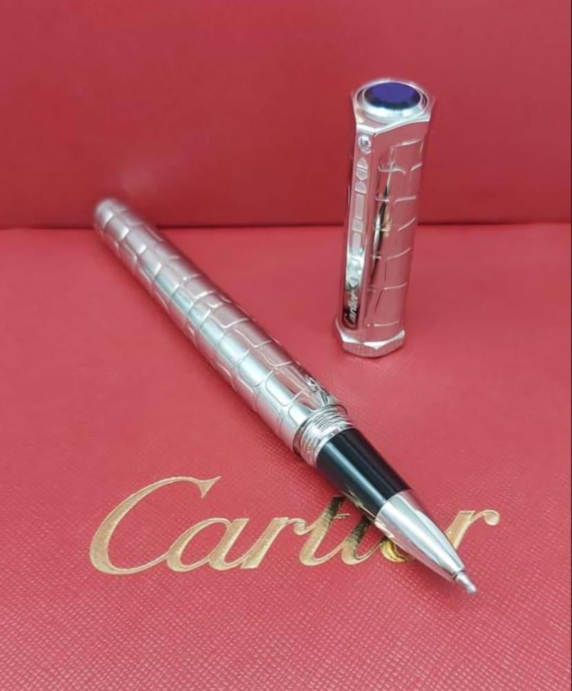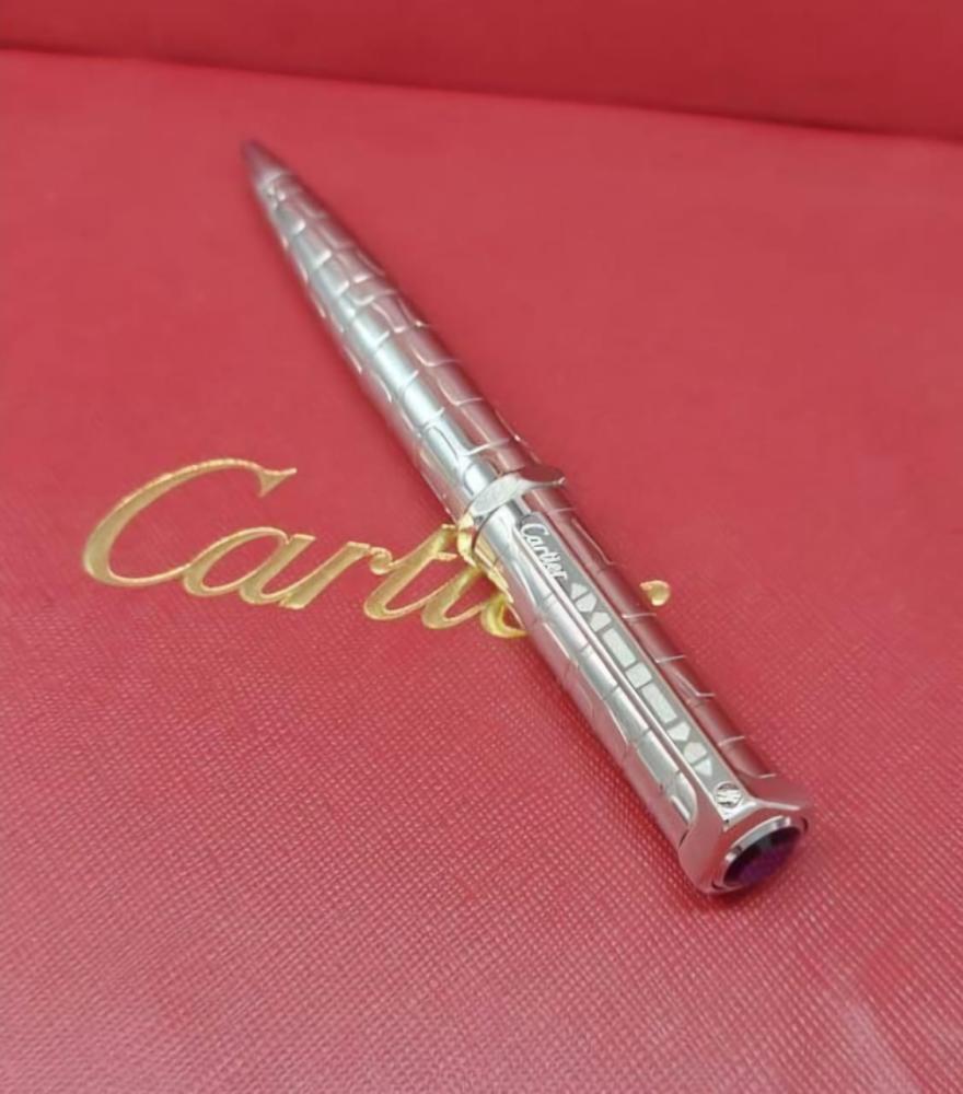 قلم أنيق يلفت النظر، بلون فضي راقٍ وتصميم يحمل بصمة كارتييه المميزة.