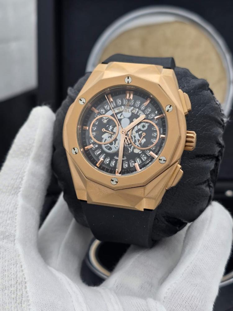 ساعة هوبلو الرجالية ب تصميم هيكلي (Skeleton) يكشف تفاصيل المينا بشكل عصري وفخم.